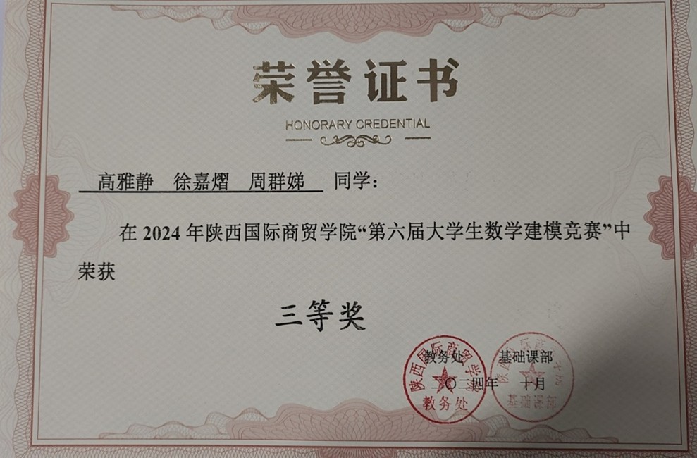 个人荣誉:第十届“东方财富杯”全国大学生金融挑战赛优秀奖,2023-2024优秀志愿者,2023全国大学生数学建模竞赛校赛二等奖,2024全国大学生数学建模竞赛校赛三等奖,羽毛球单打校级二等奖,羽毛球比赛优秀运动员。