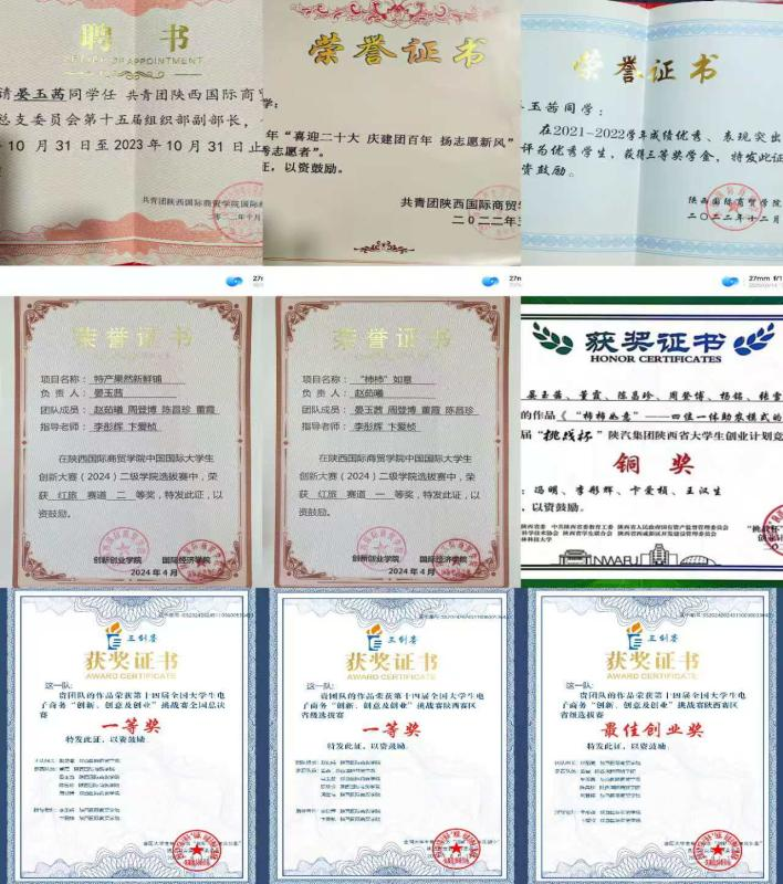2024年12月发表论文《陕西省农民参与农村电商意愿的影响因素研究》;2024年8月获第十四届全国大学生电子商务“创新、创意及创业”挑战赛全国总决赛一等奖、陕西省一等奖及单项创业奖;2024年6月荣获第十二届“挑战杯”陕汽集团陕西省大学生创业计划竞赛陕西省铜奖;2023年10月在学校开展学生养成工程活动中荣获先进个人;2022年12月被评为优秀学生,获得三等奖学金;2022年5月被评为优秀志愿者。
