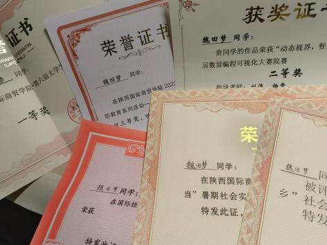在过去一年,我先后获得2023年朗诵比赛二等奖和三等奖、2023-2024年团干部素质能力大赛一等奖、2023年辩论赛团体赛二等奖、第十四届“创新、创意及创业”比赛二等奖和最佳创意奖、第四届陕西省高校企业模拟大赛三等奖以及2024年“第三届阅读马拉松”活动三等奖等等