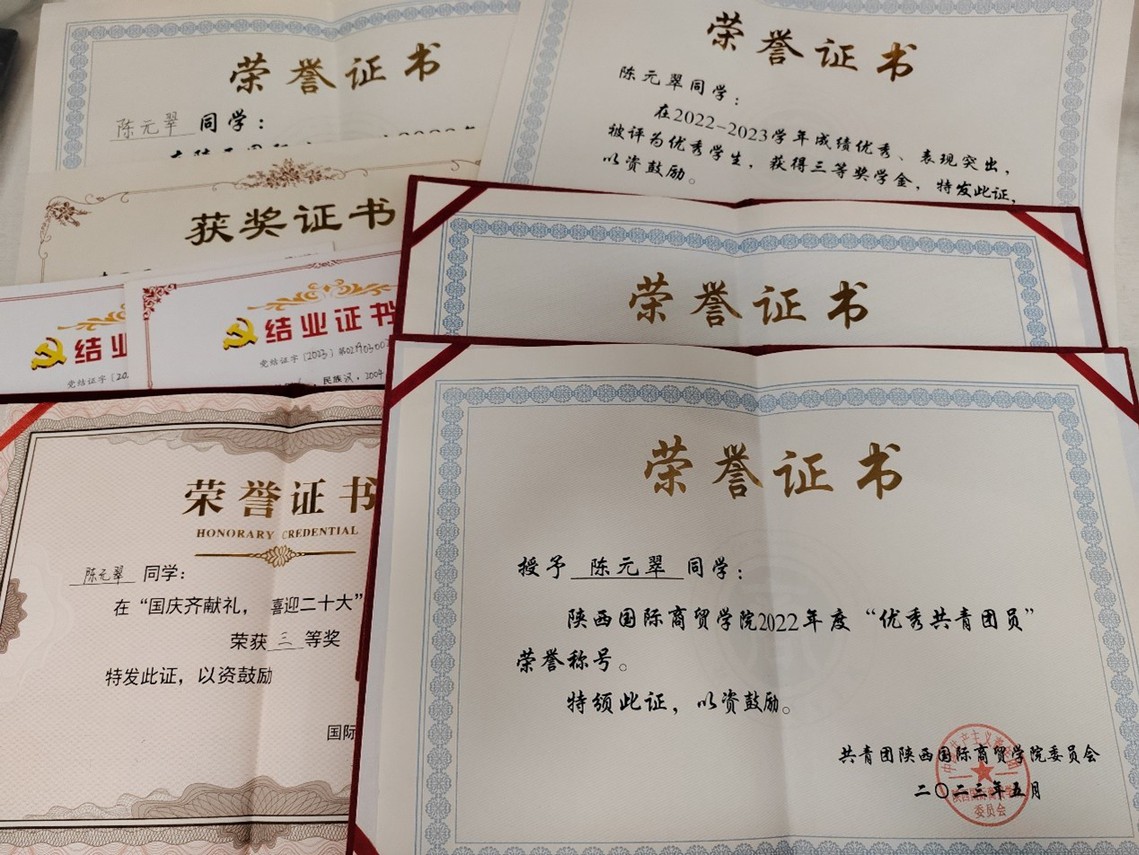 自入学以来,我先后荣获了2022年度“优秀共青团员”、大学生创新训练计划项目省级立项、2022-2023学年“优秀学生三等奖学金”、“国庆齐献礼,喜迎二十大”摄影大赛三等奖、“第二届全国ETF模拟投资箐英挑战赛”优秀奖、“美育浸润行动”团队二等奖。