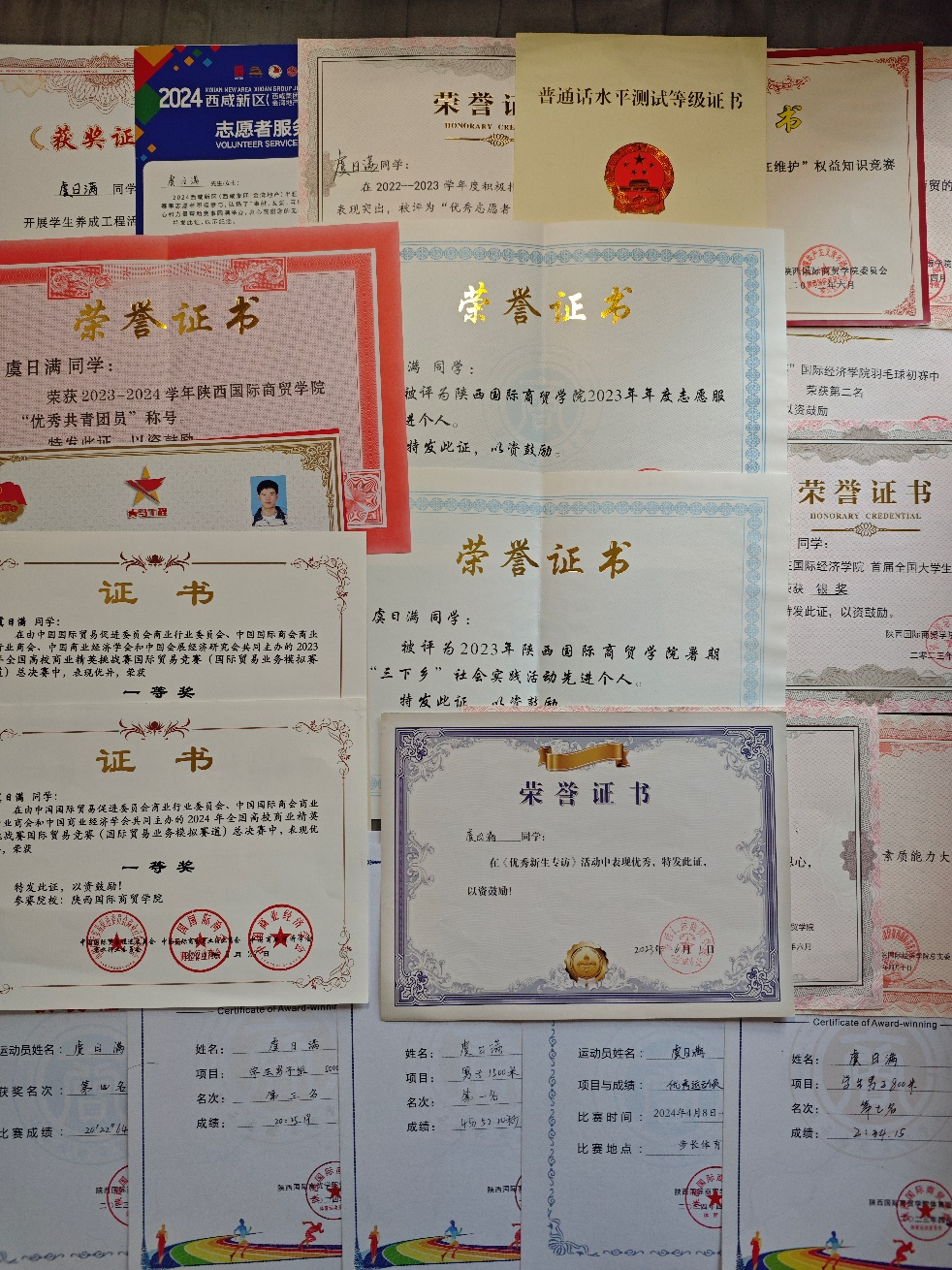 2023-2024学年国家励志奖学金、2024年优秀共青团员, 2022-2023学年优秀学生二等奖学金、2024年全国高校商业精英挑战赛国际贸易竞赛全国一等奖、2024年志愿青年学刊收录报告出版1篇、2024年参与西安社会科学基金项目1项、校级科研项目1项、2024年羽毛球优秀运动员、2024年运动会1500米第一、5000米第三名、2024年互联网大赛三项三等奖、2024年“外教社杯”由于跨文化赛校赛优秀奖、2024年马拉松大众等级二级、2024年东方财富理财实训课程结业、青马工程结业、2024年“诚信铸魂感恩心,砥砺前行筑未来”演讲大赛三等奖。