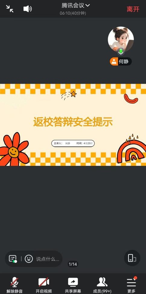 班会上,何静老师首先向同学们详细讲解了毕业论文答辩的相关安排和注意事项。她强调了答辩的重要性,鼓励同学们认真准备,积极应对,展现自己大学期间的学习成果。同时,何老师也提醒同学们要严格遵守答辩流程,注意仪容仪表,展现良好的精神风貌。考虑到同学们即将返校参加答辩,何老师着重强调了返校途中的安全问题。她提醒同学们要提前规划好行程,选择安全的交通方式,并注意个人财物安全,谨防诈骗。同时,何老师也提醒同学们要调整好心态,积极面对就业压力,保持自信,坚持不懈地寻找适合自己的工作。