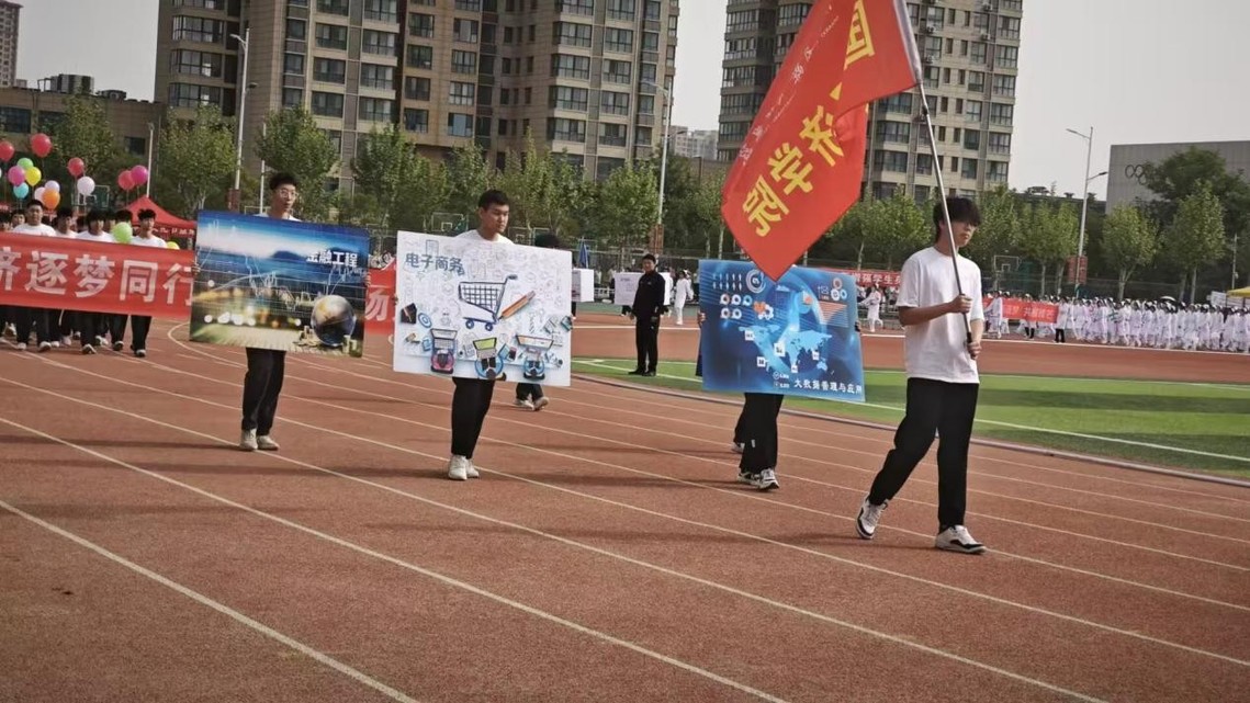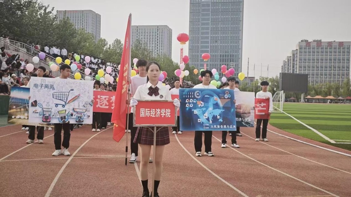 现在迎面走来的是国际经济学院学生方队!他们步伐铿锵,意气风发,青春的脸庞洋溢着自信与活力。作为学院最富朝气的群体,他们在学术中探索真知,在赛场上挥洒汗水,在实践中锤炼品格。此刻,他们以整齐的方阵、嘹亮的口号展现新时代学子的风采,誓将用拼搏与热情为运动会增添最亮丽的色彩!