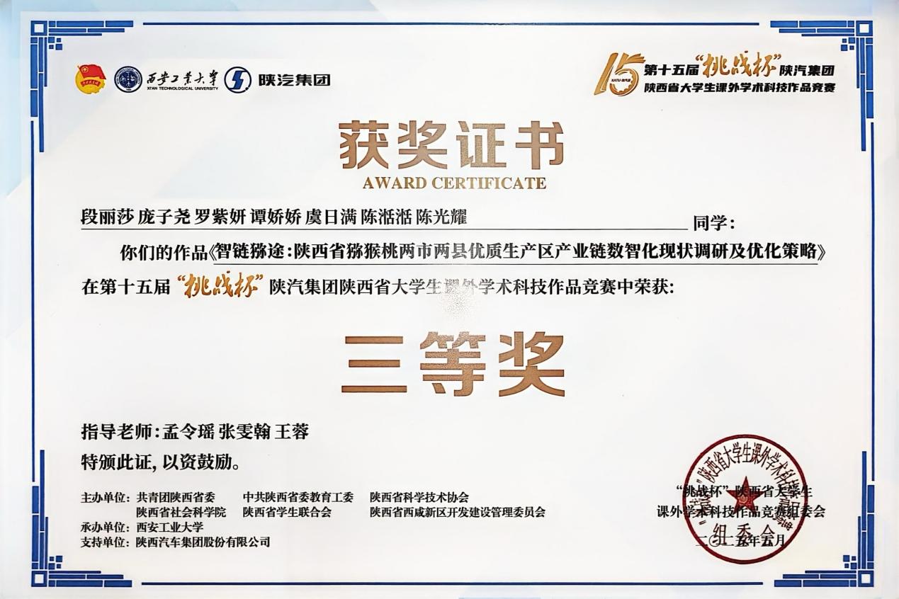 第十五届“挑战杯”陕汽集团陕西省大学生课外学术科技作品竞赛结果正式公布,陕西国际商贸学院国际经济学院参赛团队凭借扎实的研究成果与创新实践,从众多优秀项目中脱颖而出,荣获省赛三等奖。这份荣誉的背后,是师生团队历经数月的日夜奋战与精益求精的不懈追求。