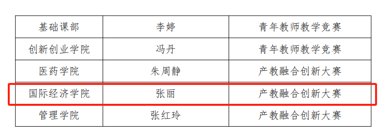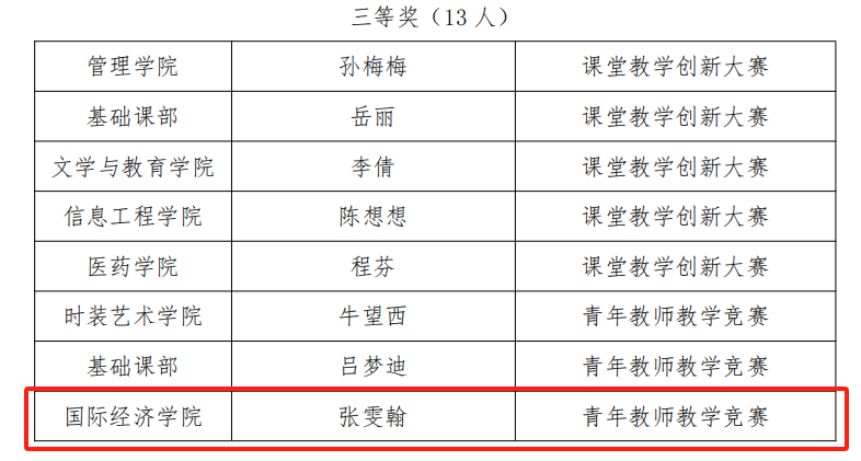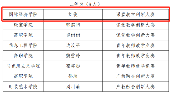 青年教师吴姝煜、张雯翰在青年教师教学竞赛中分别荣获一、三等奖;卞爱祯、张丽老师分别在产教融合创新大赛中获一、三等奖;刘俊教师在课堂教学创新大赛中荣获二等奖。吴姝煜老师获青年教师讲课大赛教学单项奖。