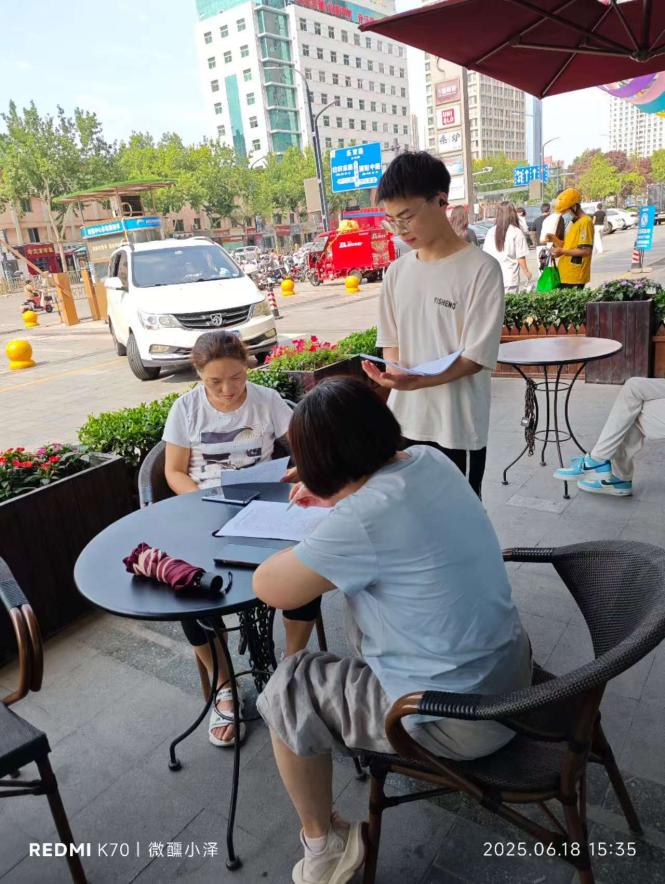 调研过程中,同学们克服高温酷暑天气带来的不适,深入街头巷尾与咸阳市民展开细致交流,更以耐心亲和的态度引导咸阳市民完成问卷填写,用实际行动推动调研工作的顺利完成。通过此次实践,同学们不仅熟练掌握了问卷设计、数据采集等调研方法,更在与不同群体的互动中提升了沟通协调能力和问题解决能力,真切感受到实践对于知识转化的重要意义。
