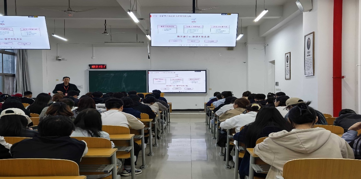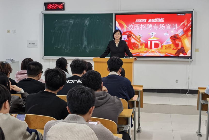 为切实做好经济与管理学院2026届毕业生就业工作,9月24日晚自习期间,京东集团校企合作部西北区负责人白光泽经理在2号教学楼133教室开展京东集团走进经管学院2026届毕业生校园专场招聘活动。会议由副院长张丽主持,学生科科长李晶、辅导员刘翔老师组织物流管理、电子商务、市场营销专业约100名同学参与专场招聘活动。