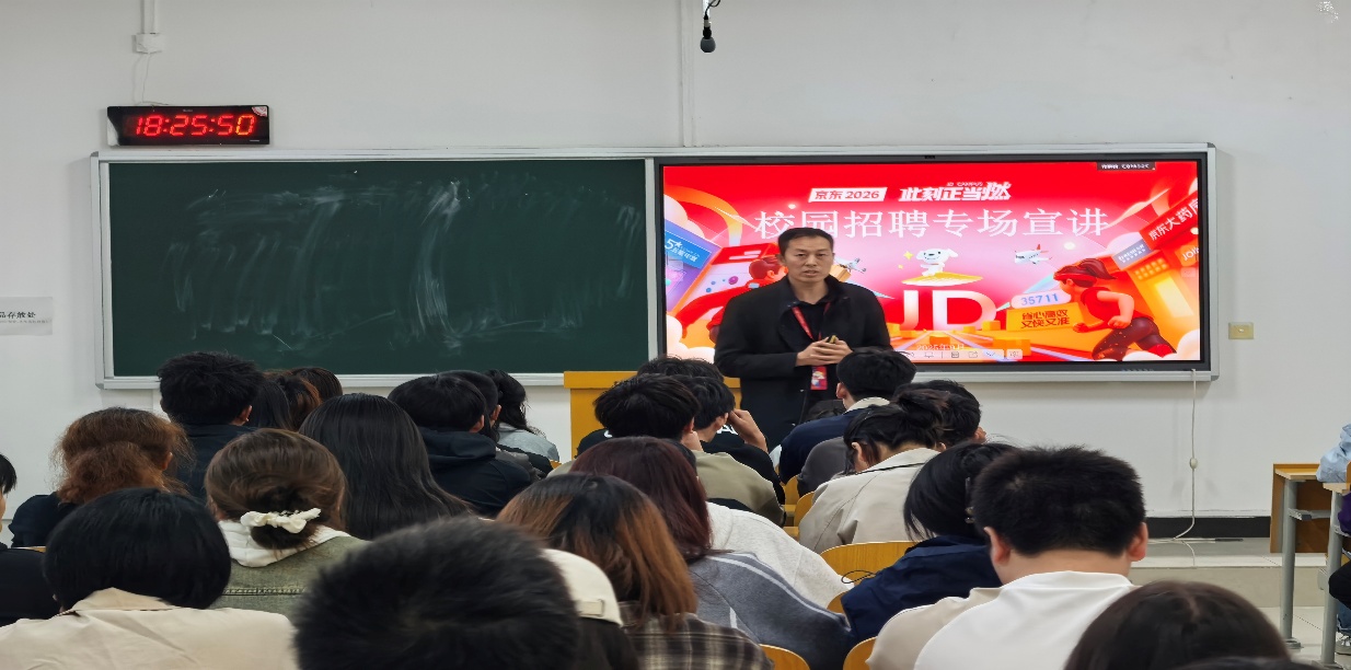 在互动答疑环节,同学们围绕岗位投递流程、实习安排、跨专业求职适配性等问题积极提问,白经理逐一耐心解答,并现场指导大家如何结合自身优势匹配岗位需求,同时预留了线上咨询渠道,方便后续进一步沟通、组织面试。现场氛围热烈,有十几位同学现场投递了简历,同学们纷纷表示此次宣讲会干货满满,不仅深入了解了京东集团的人才培养体系,更明晰了自身的职业规划方向。